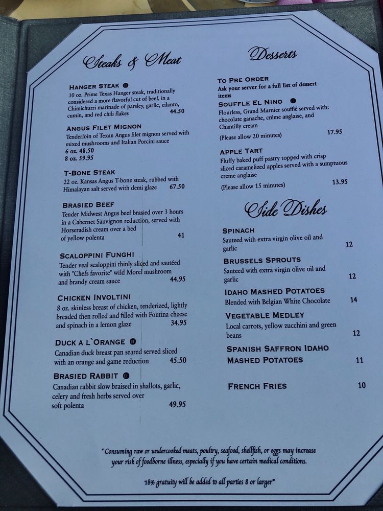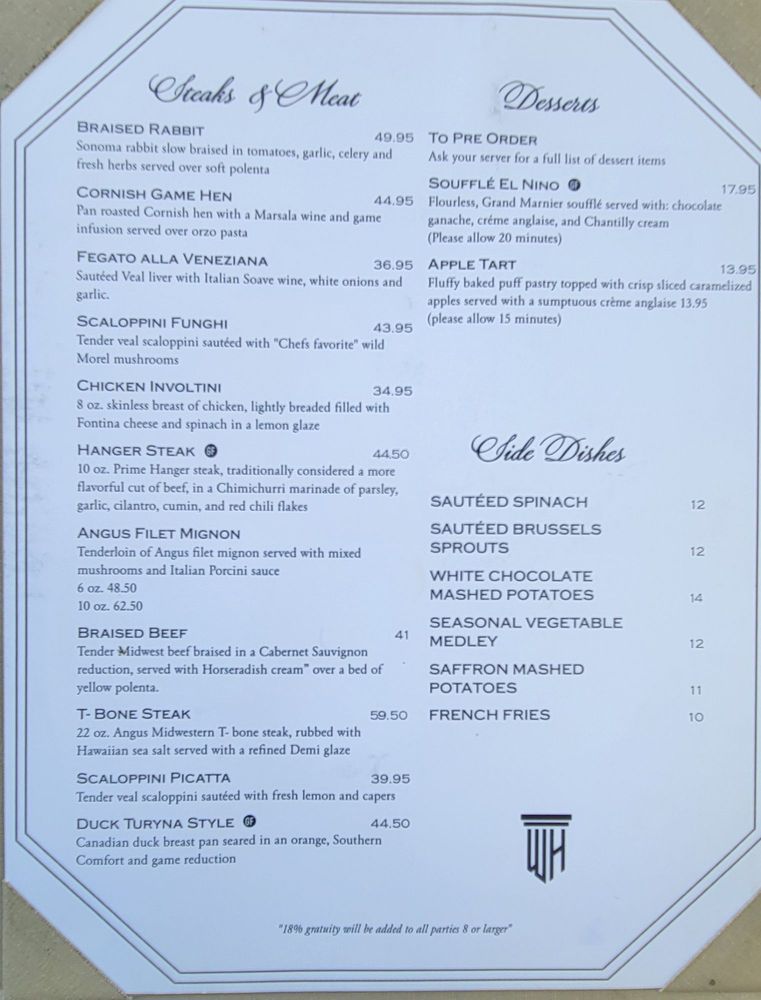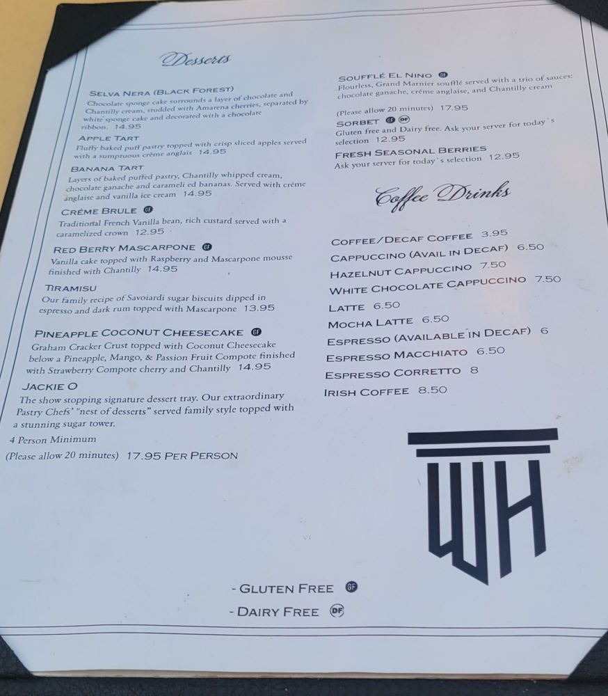 The show stopping signature dessert tray. Our extraordinary Pastry Chef's "nest of desserts" served family style topped with a stunning sugar tower. [ person minimum] [$. per person]