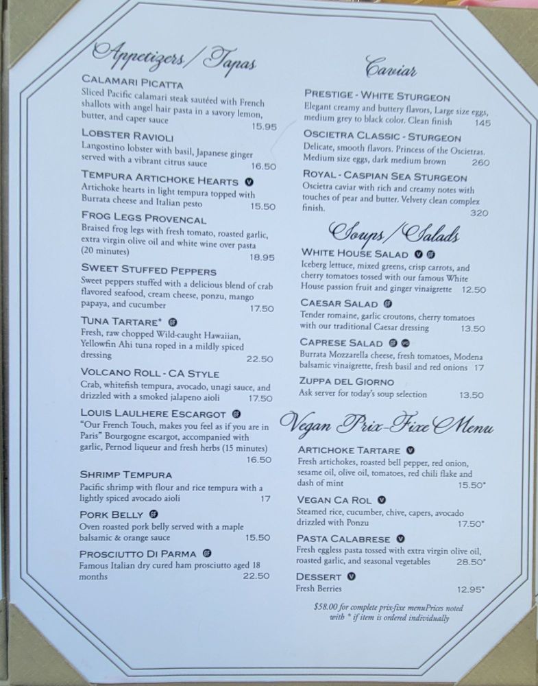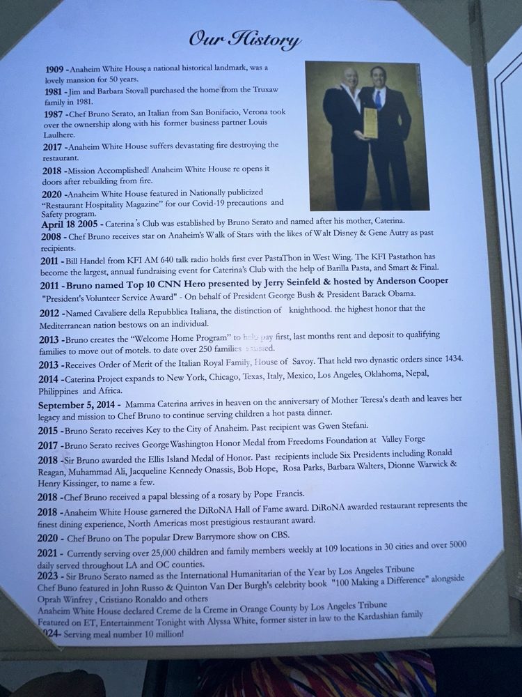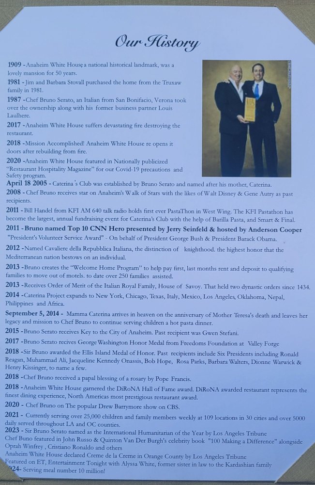 Anaheim White House is a trendy restaurant offering a mix of steakhouses, seafood, and Italian cuisine. Situated in Anaheim, CA, this establishment is known for its excellent service and delicious food options. Customers rave about the top-notch service and the intimate, classy ambiance. The decor exudes European elegance, creating a romantic atmosphere for special occasions. The outdoor seating area is perfect for a more relaxed dining experience. The menu features a variety of vegan and vegetarian options, making it a great choice for all dietary preferences. Whether you're celebrating an anniversary, birthday, or just looking for a memorable dining experience, Anaheim White House guarantees a fantastic time. With a wide range of amenities like valet parking, wheelchair accessibility, and free Wi-Fi, this restaurant is well-equipped to cater to a diverse clientele. Indulge in their delectable dishes and enjoy a truly unforgettable dining experience at Anaheim White House.
